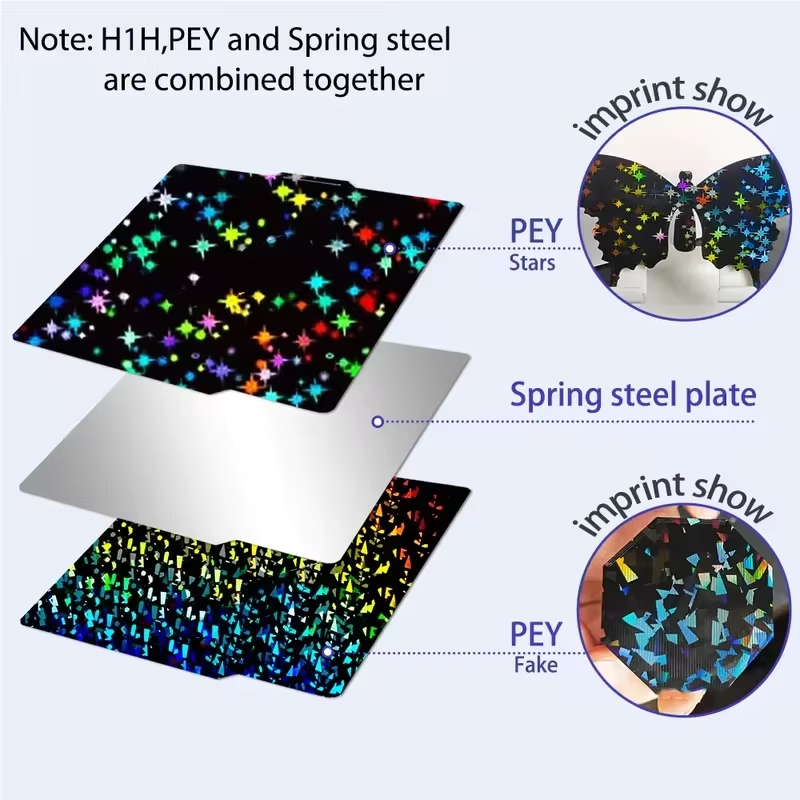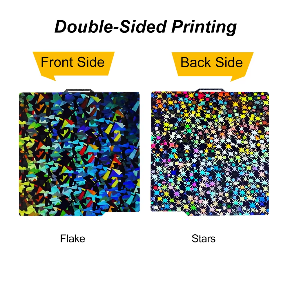 The PEF Flake side provides strong first-layer adhesion and a subtle textured matte look ideal for functional parts and detailed prints. Flip to the PEF-Star side for a refined, shimmering surface that delivers smooth, visually striking bottoms on decorative or display pieces.