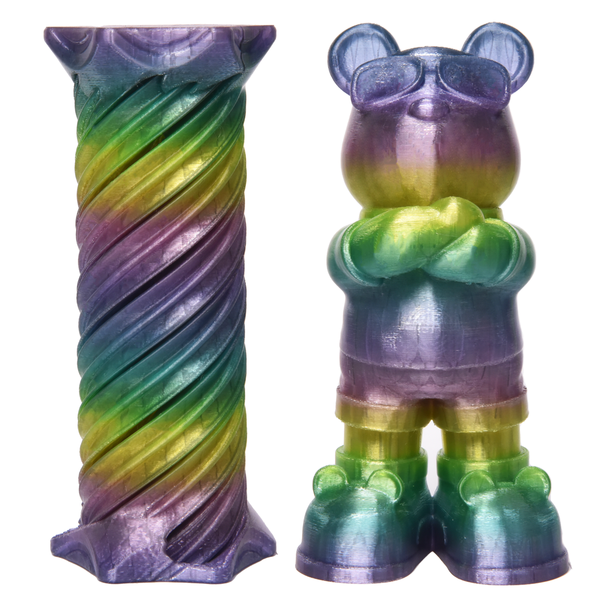 Rainbow colour transitions occur naturally along the filament length. Final appearance will vary depending on model size, geometry, wall thickness, and print settings.